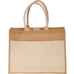Additional InformationTote bag made of jute fibre and 8 oz. canvas with webbed handles and a front pocket that measures 17.75" W x 13.75" H x 6" gusset.