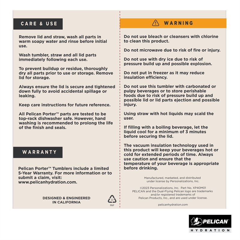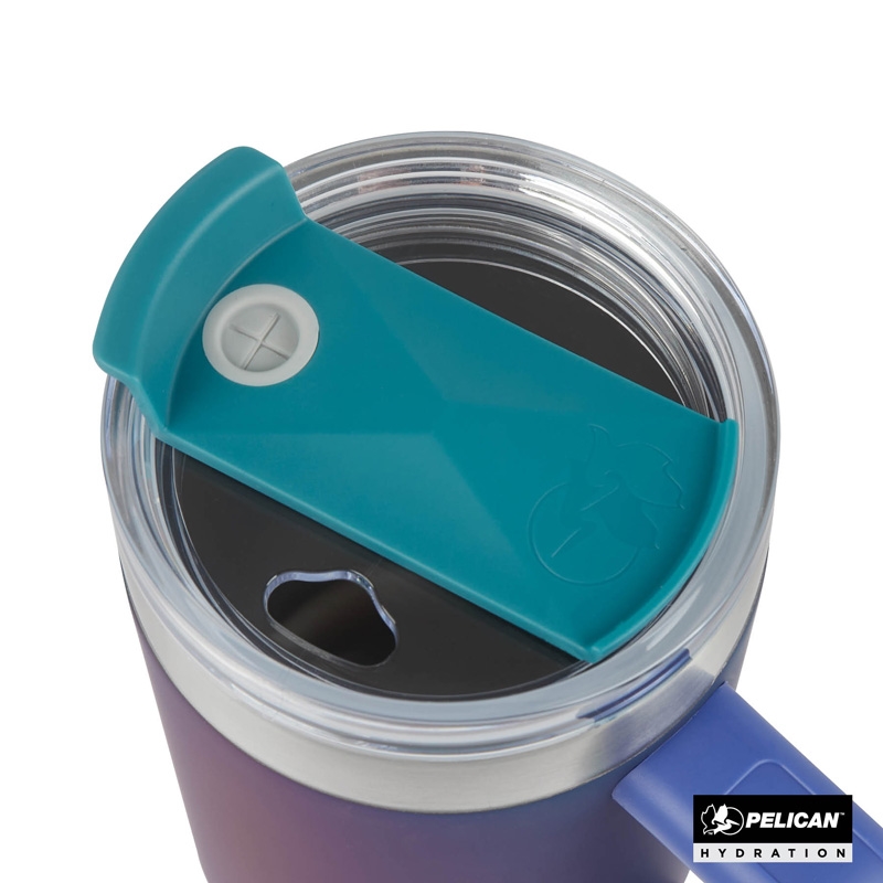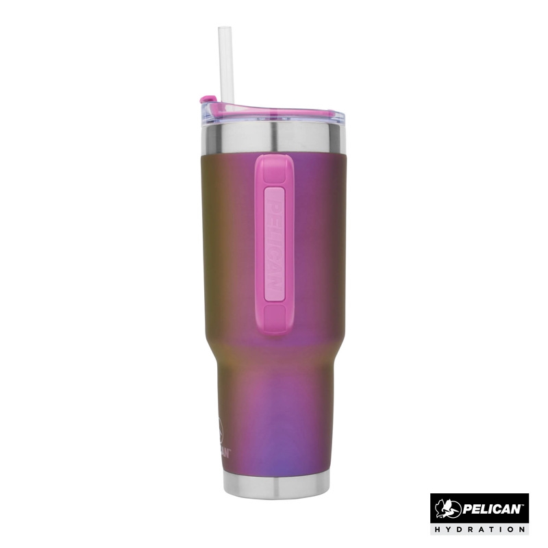Hydrate all day with the 40 oz. Pelican Porter™ - Shimmer Collection Travel Tumbler, an impeccable companion designed to keep you refreshed throughout your daily adventures. The double-injected ergonomic handle provides a gentle touch for both carrying and sipping, and its body is dressed in eye-catching iridescence and a soft-touch rubber coat finish. Infused with a commitment to sustainability, this tumbler is crafted using 90% recycled pro-grade 18/8 stainless steel. Its double-wall vacuum-insulated construction and copper lining extends the warmth of your hot beverages for 9 hours and maintains the chill of your cold drinks for 16 hours. Its splash-resistant Tritan™ lid features a rotating closure, complemented by a sipper hole when you crave a warm sip, and its Tritan™ drinking straw invites you to savor your favorite cold drinks. The Pelican Porter™ also has a tapered base that seamlessly fits into cup holders. FDA compliant and BPA free.